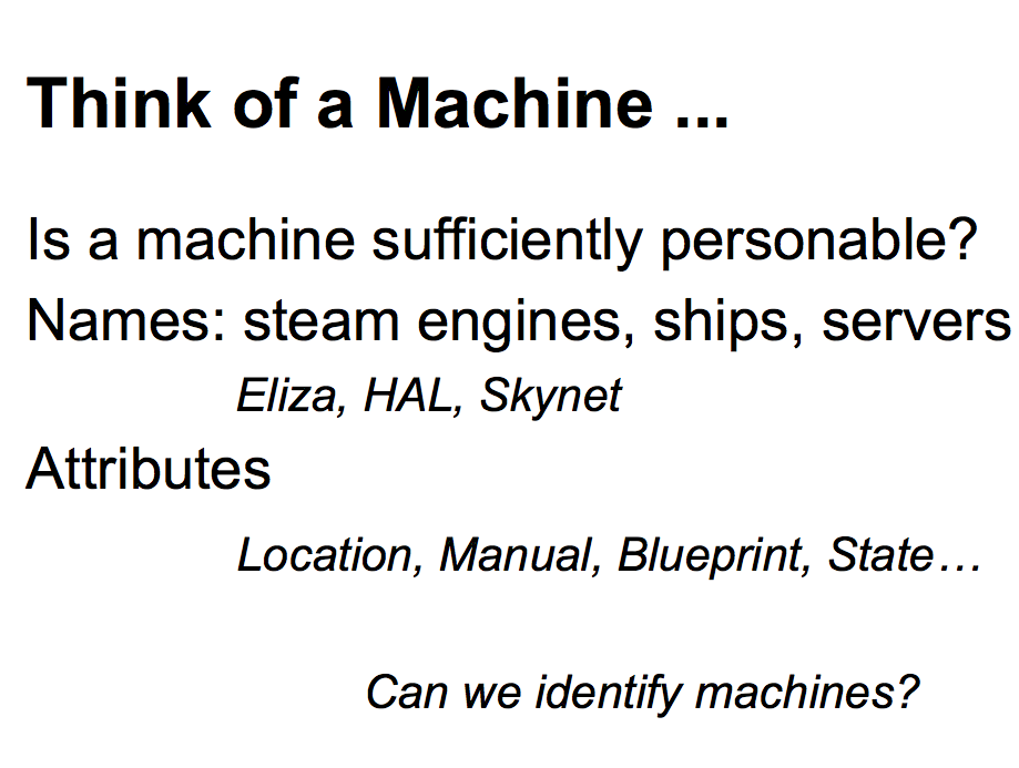 We can go further afield. In times historical, we might recall the old sea stories, where they would talk about the ships having names and the engines having names. In modern times, computers have names as do programs. Eliza is a famous old psychology program, and Hal and Skynet come from movies. When the Internet started up it seemed as if every second machine was named Gandalf. There's lots of attributes we can collect about these things as well -- can we identify machines in the same way that we can identify people? Why not? | ![]() |