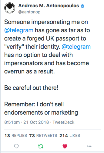 Writes Andreas Antonopolous, a noted Bitcoin commentator, that he has been impersonated with a mere scan!